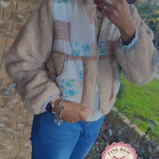 Boho Patchwork Sherpa Zip Up Jacket - Taupe Multi Colorblock