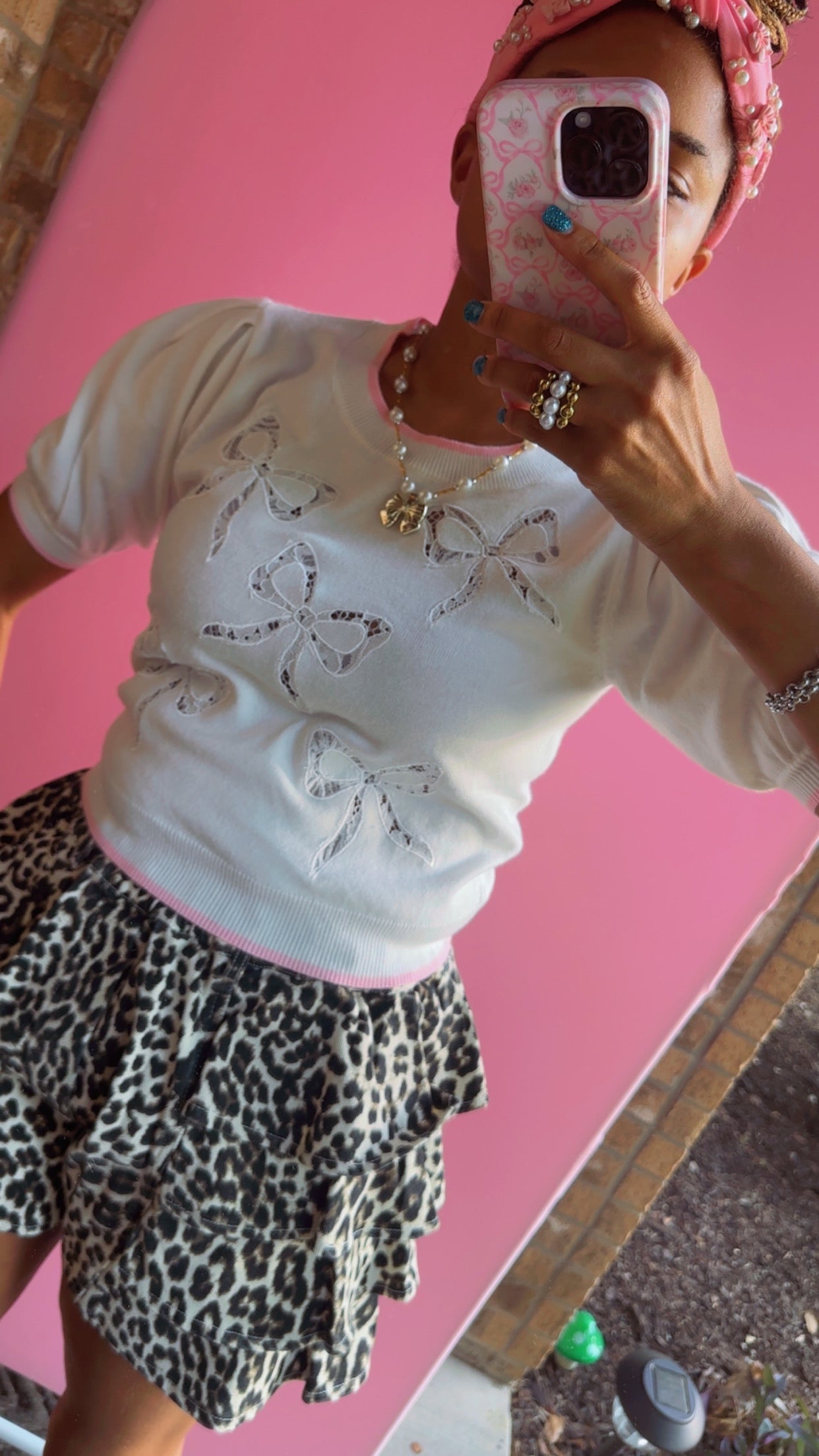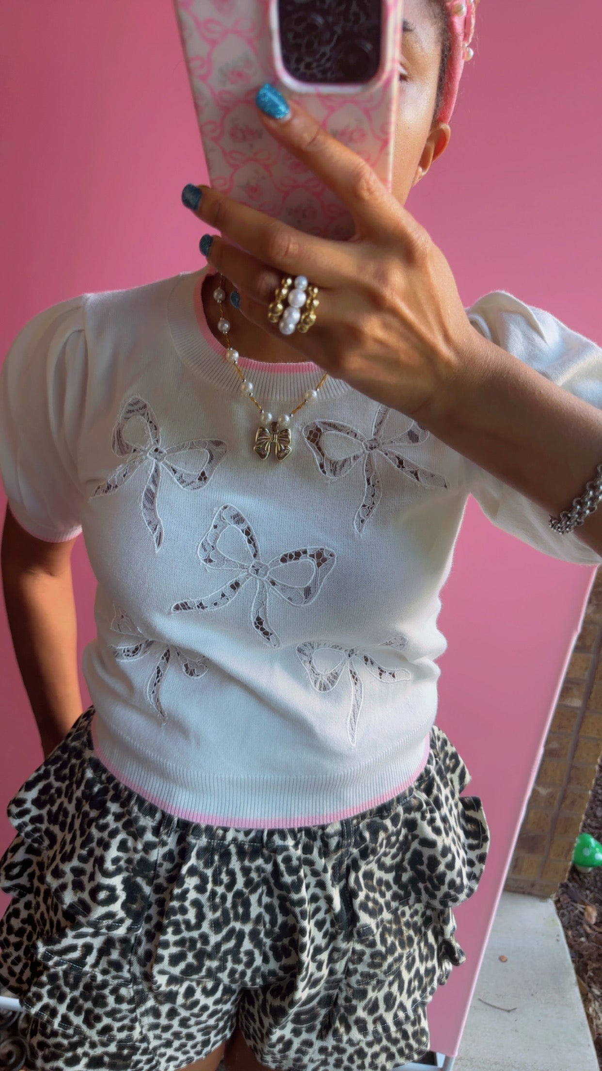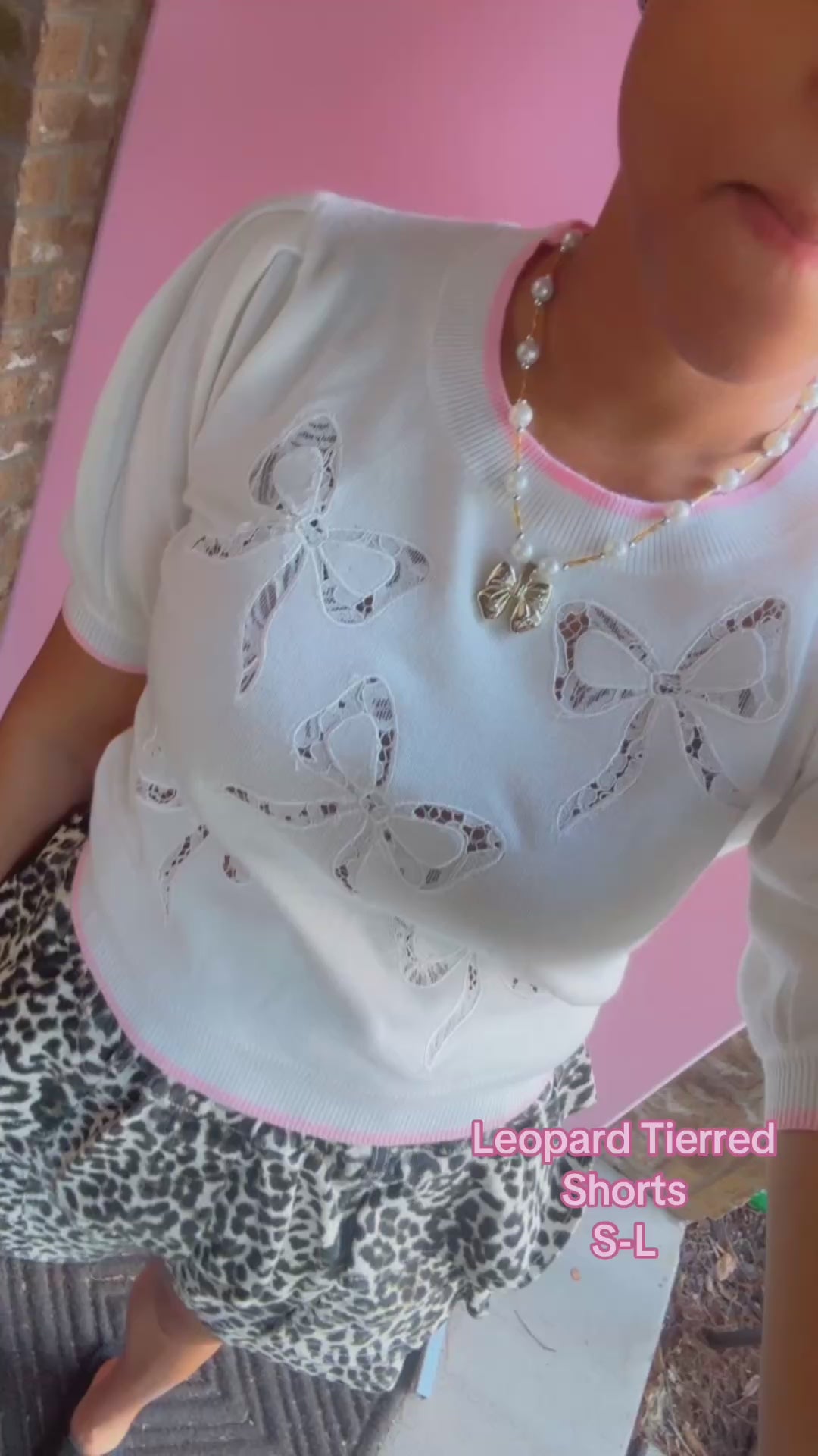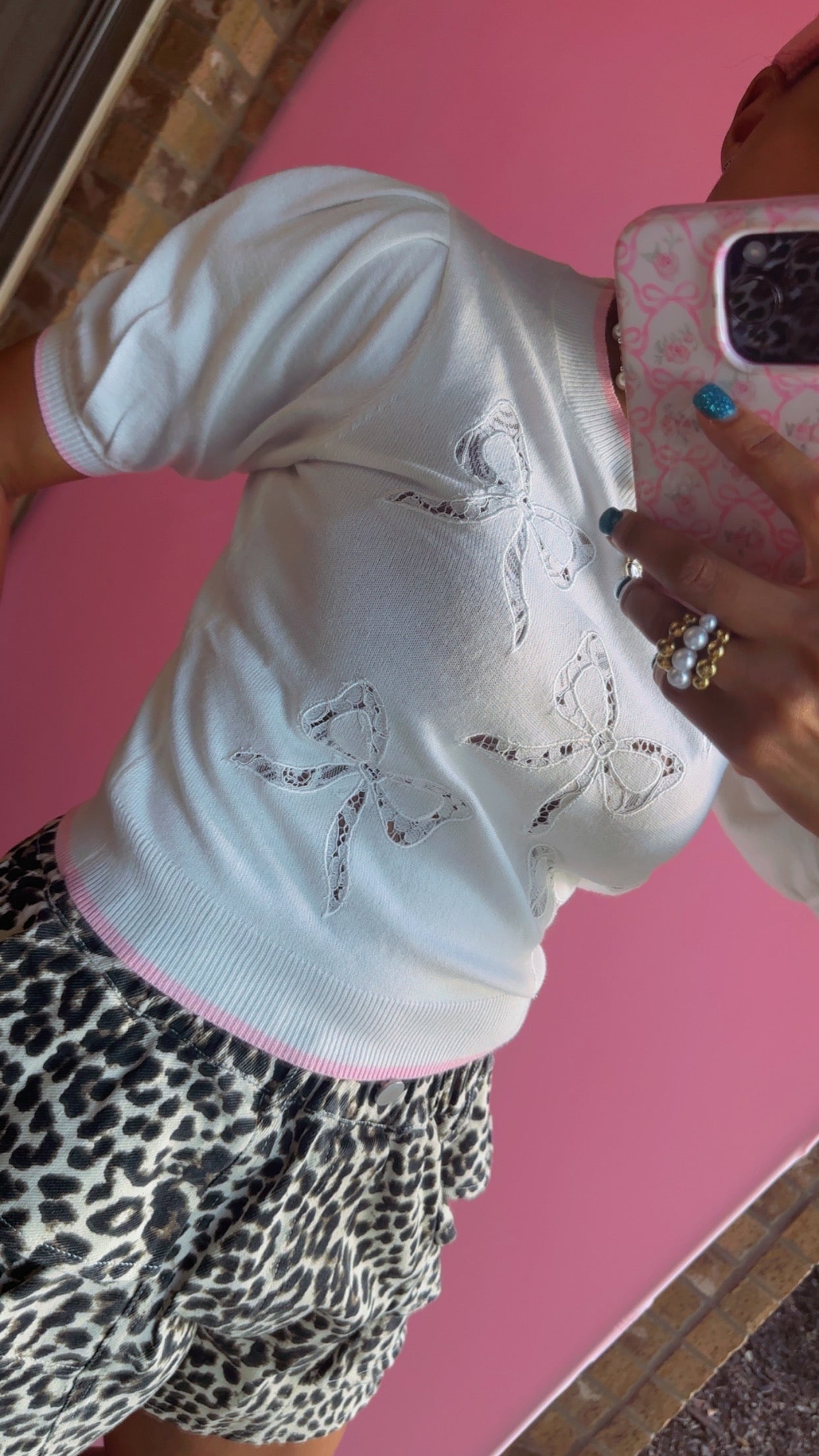 Bow Lace Laser Cut Embroidery Detail Short Sleeve Knit Top