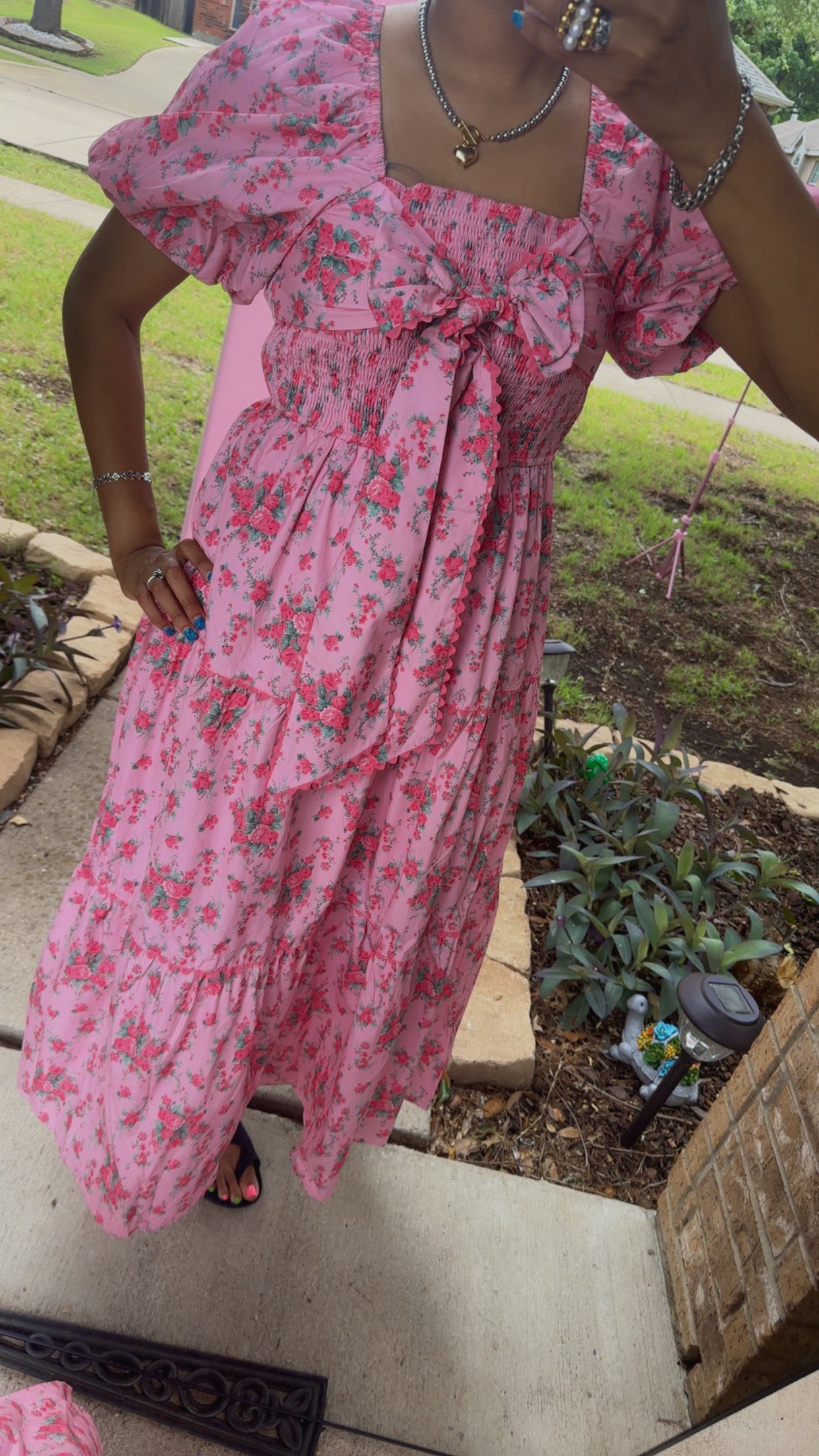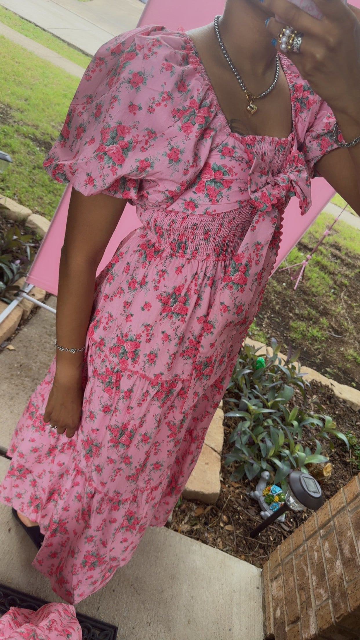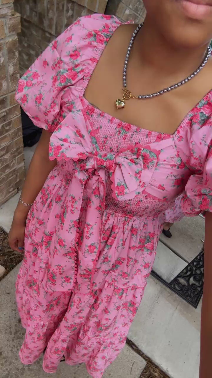 Pink Floral Printed Tiered Maxi Dress Front Bow Detail Bubble Sleeve
