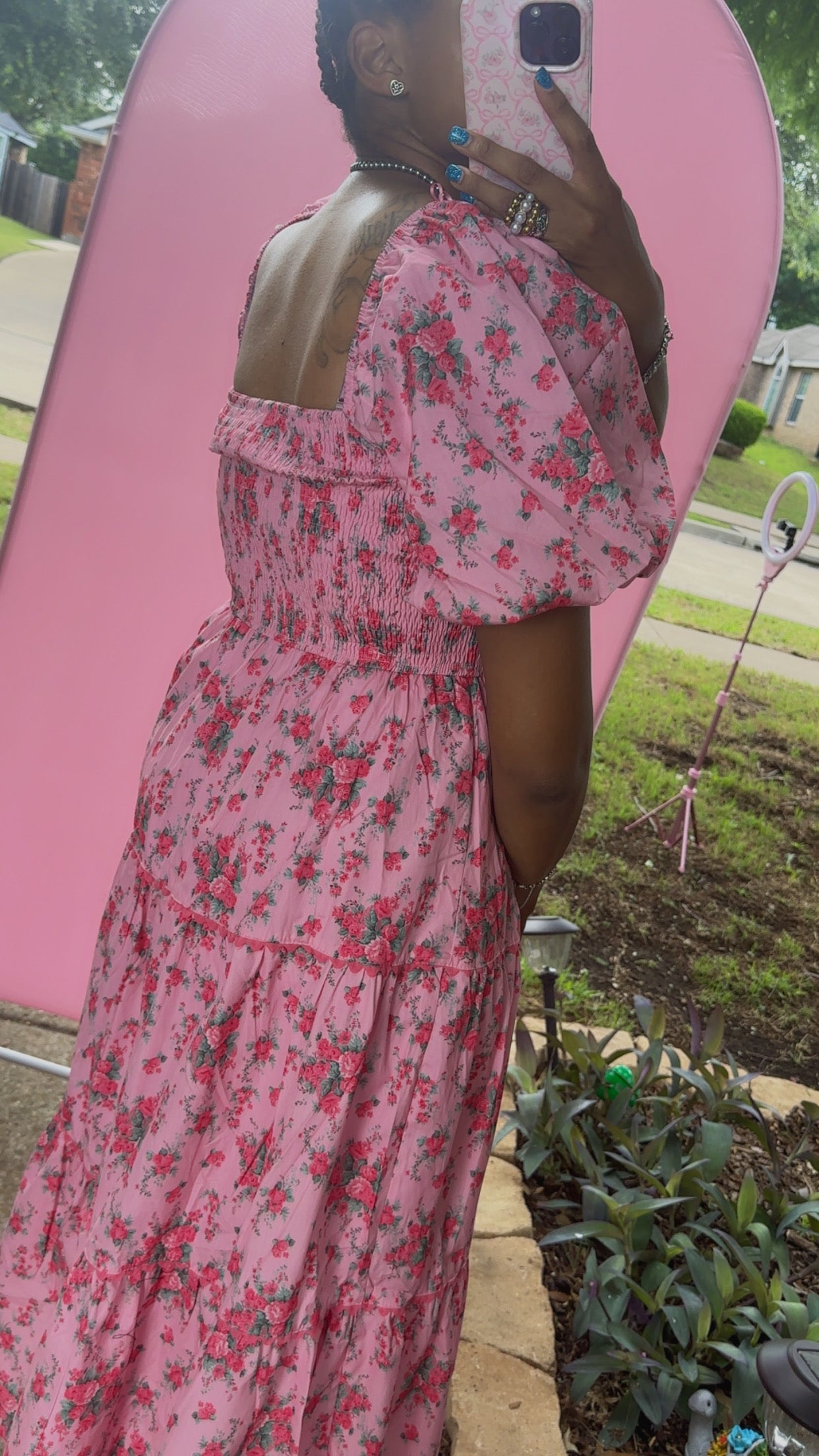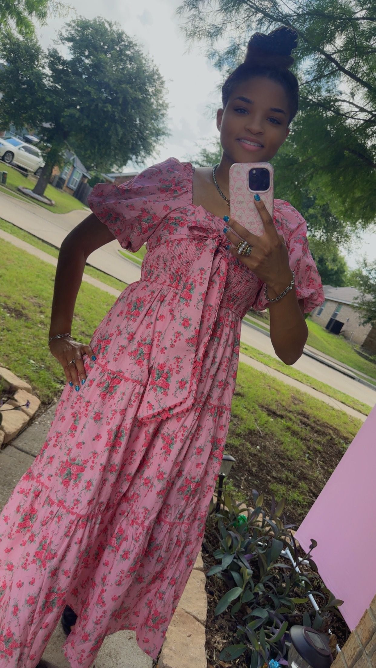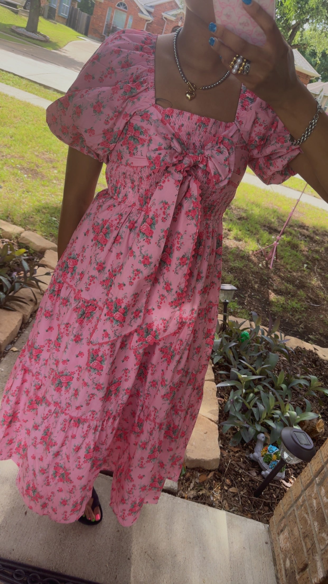 Pink Floral Printed Tiered Maxi Dress Front Bow Detail Bubble Sleeve