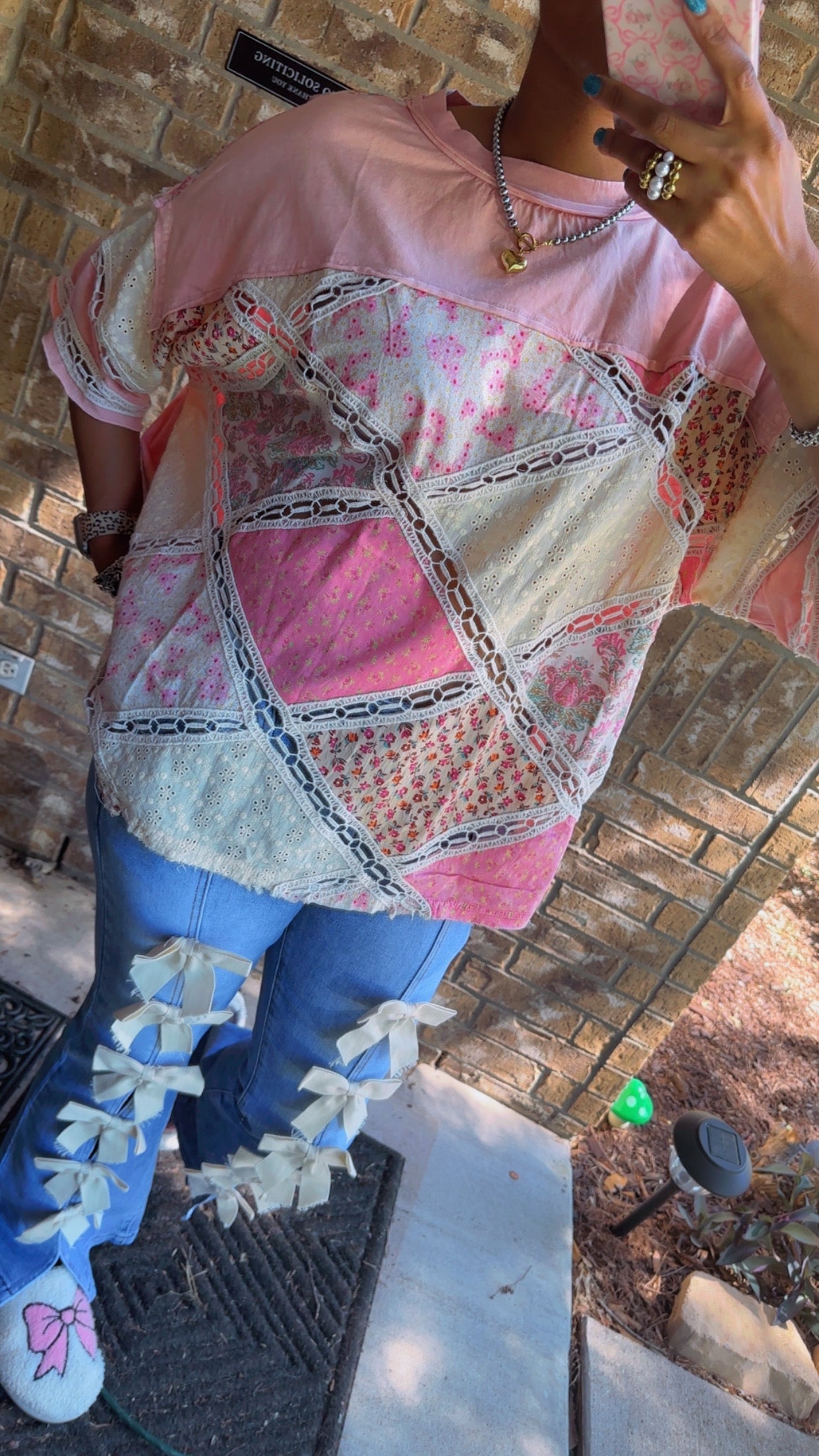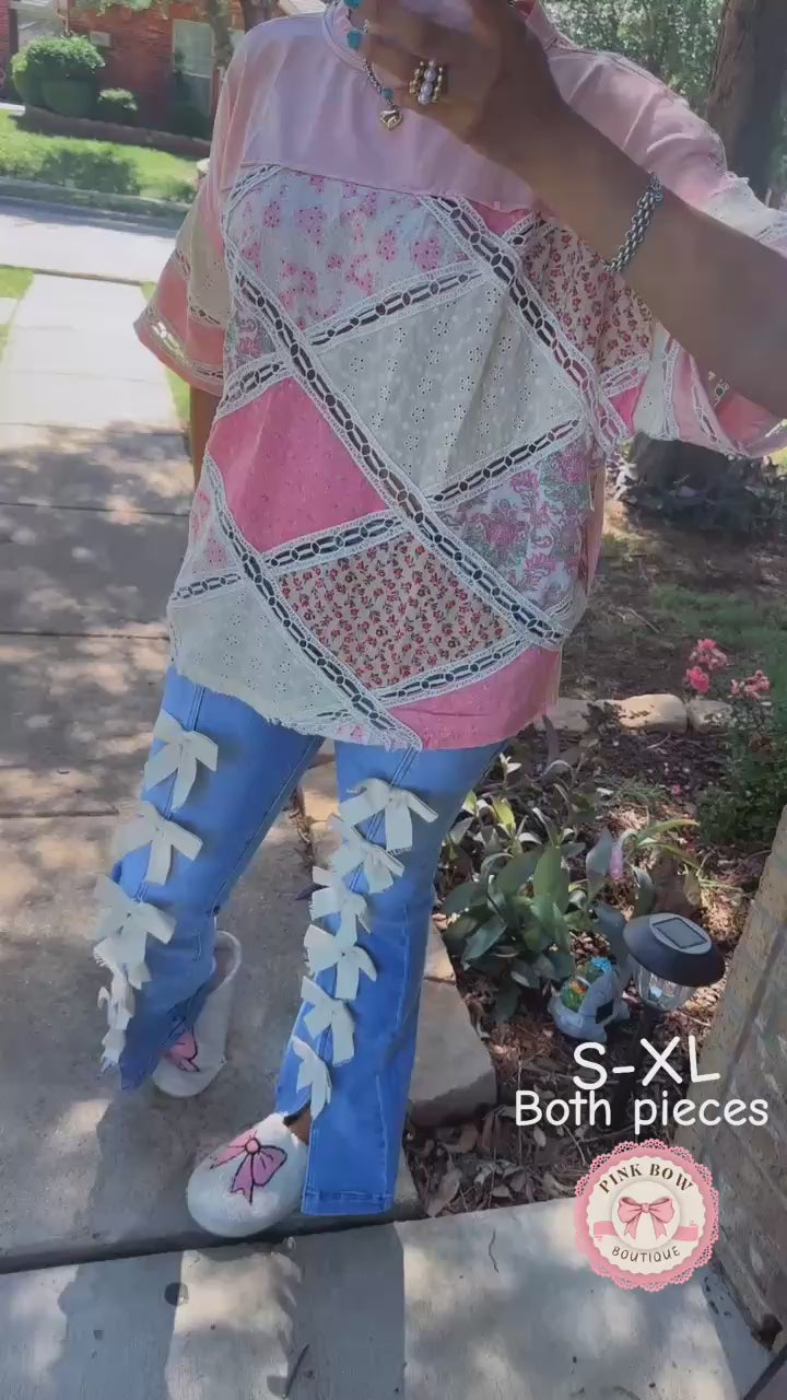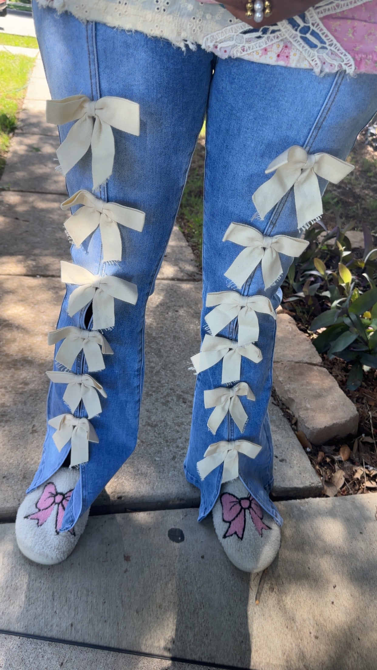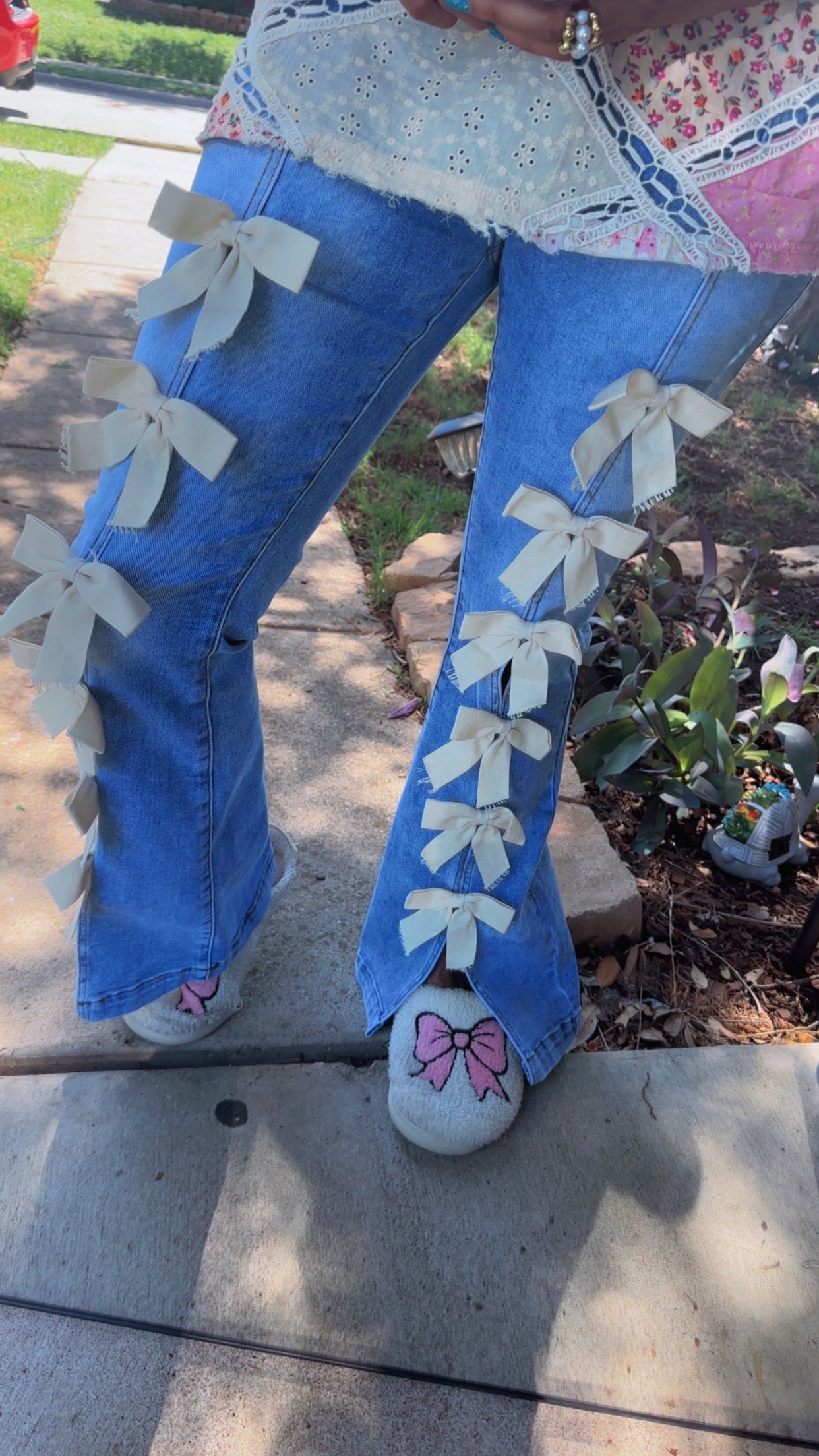 These Bow Jeans are a bold twist on classic flare jeans with ribbon detailing down the front! The high waist and stretchy fit make them both flattering and comfortable, while the mineral wash gives them a cool, lived-in look. These jeans are perfect for pairing with a tucked-in blouse and boots for a chic vibe or a casual tee and sneakers for effortless style.