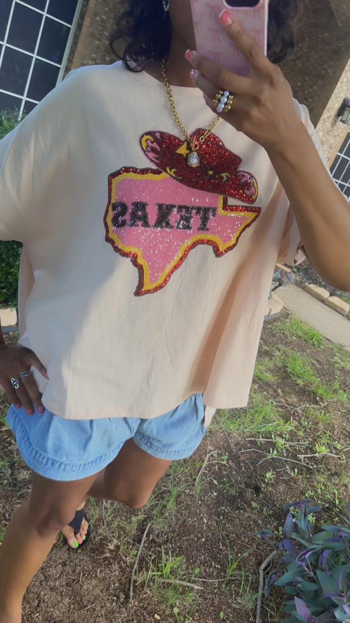 Texas Map & Cowboy Hat Sequins Short Sleeve Top