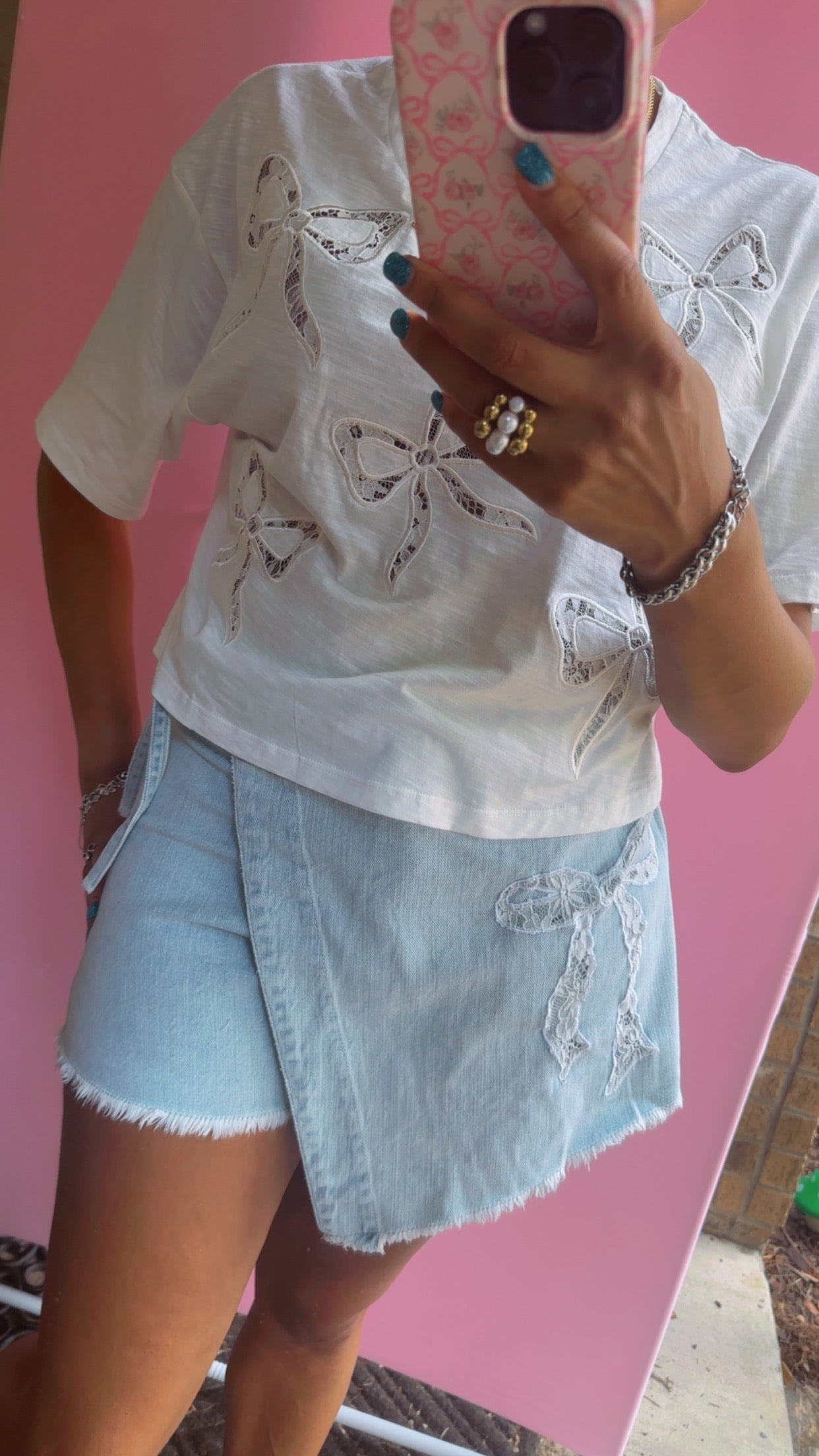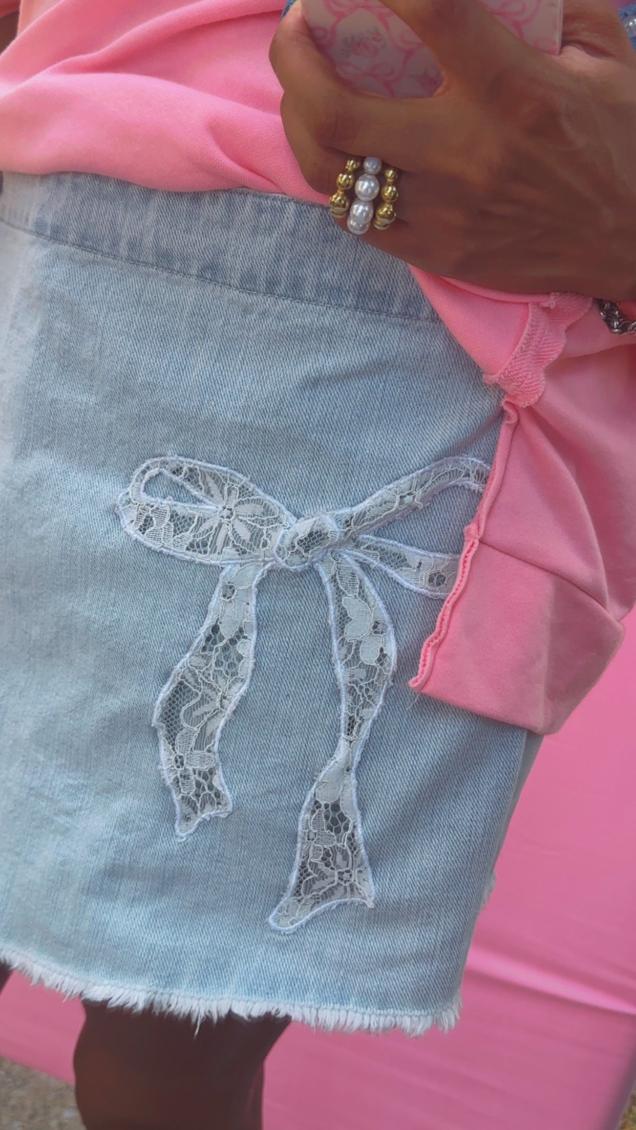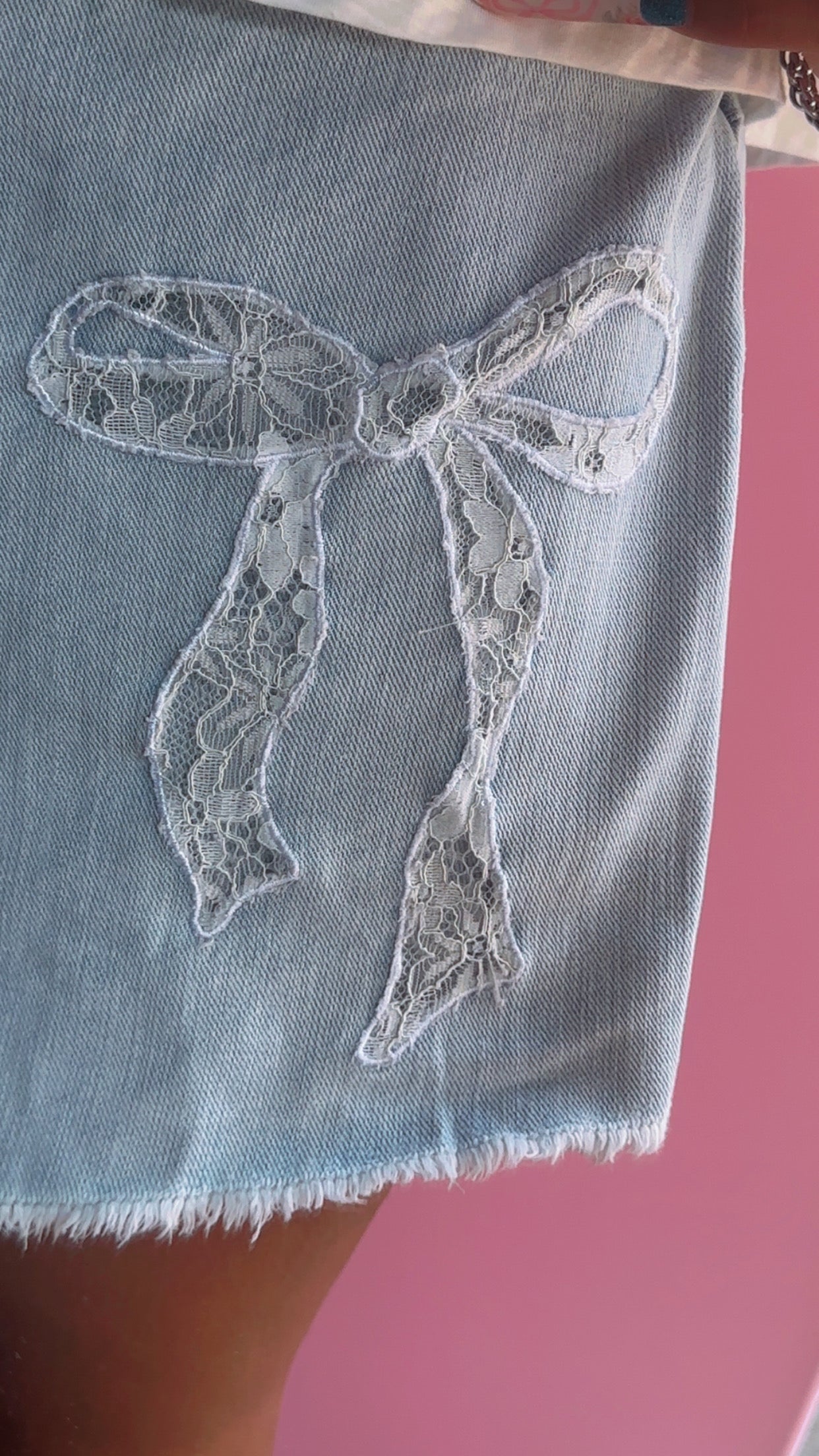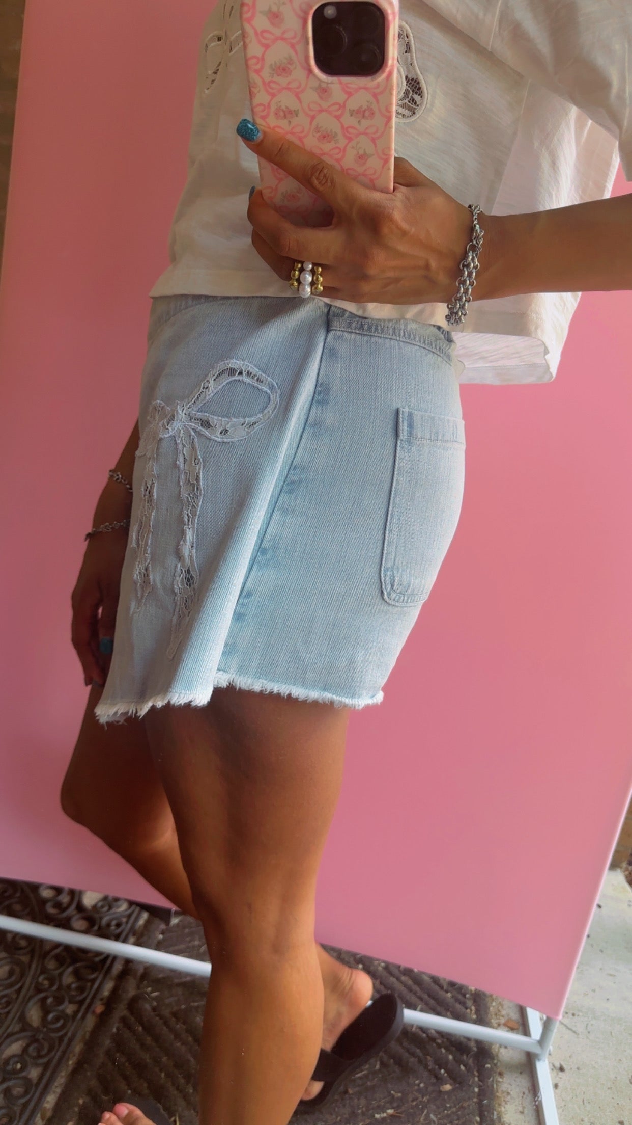 Washed Denim Bow Lace Motif Laser Cut Embroidery Detail Skort