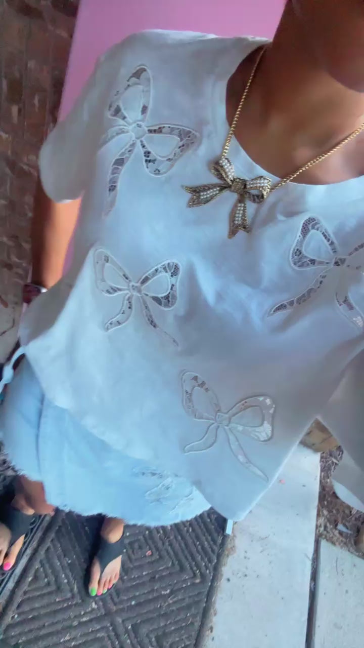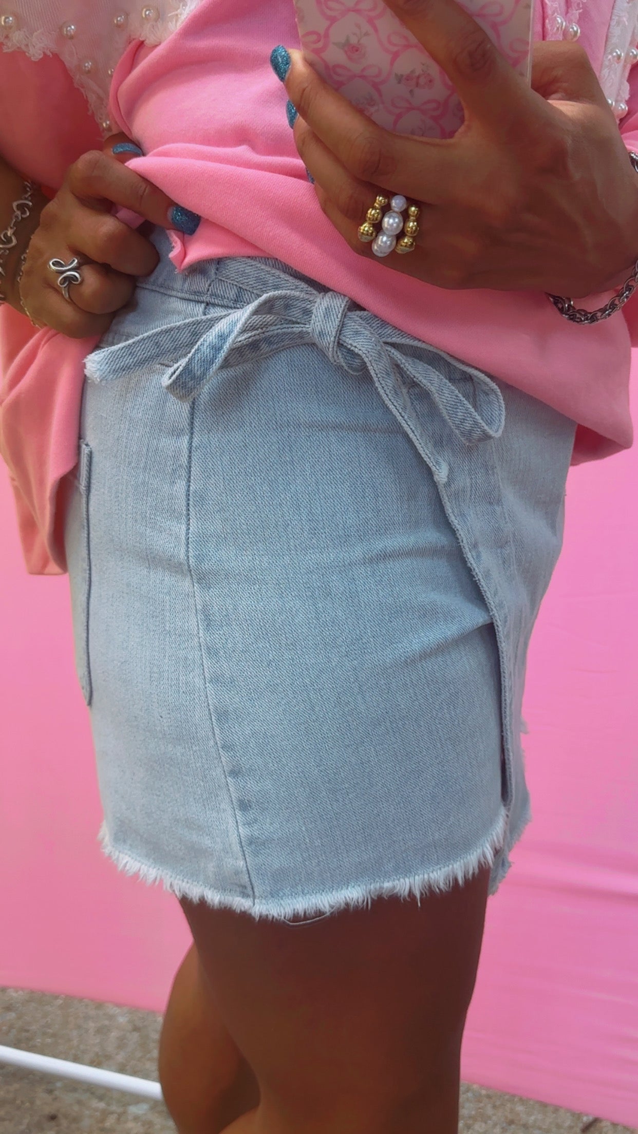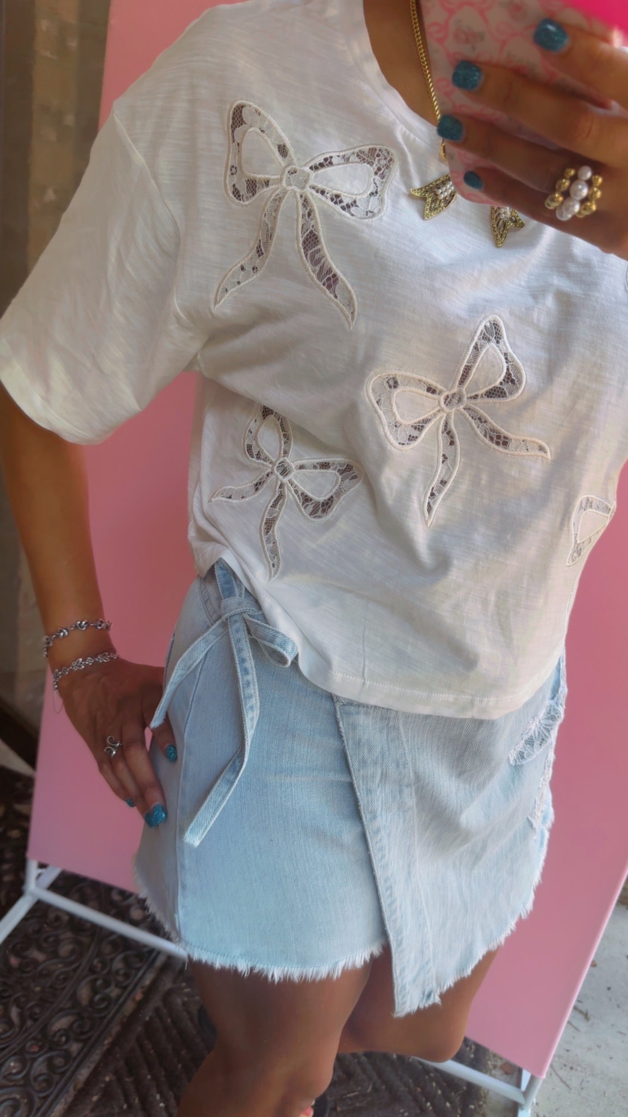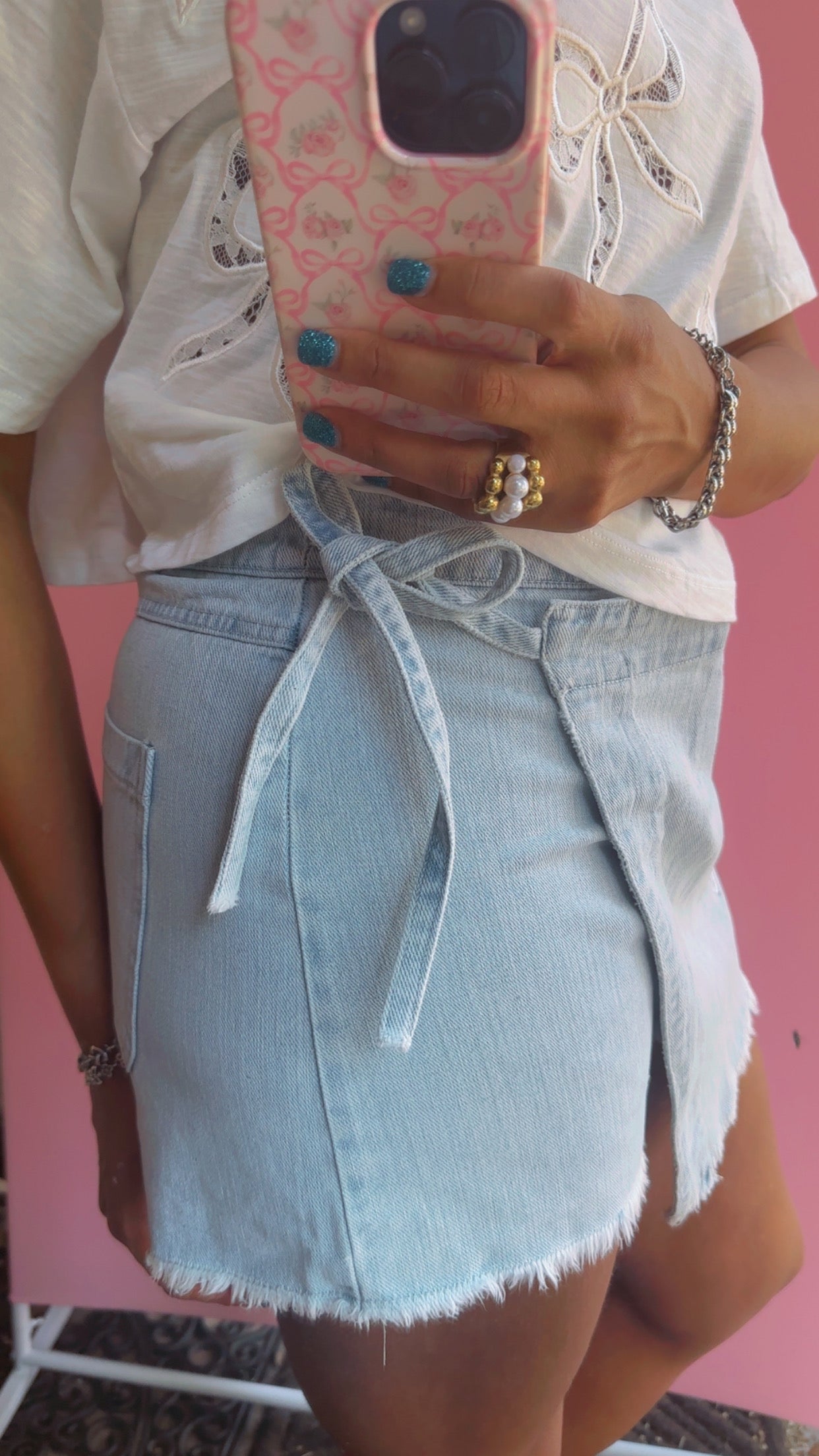 Washed Denim Bow Lace Motif Laser Cut Embroidery Detail Skort