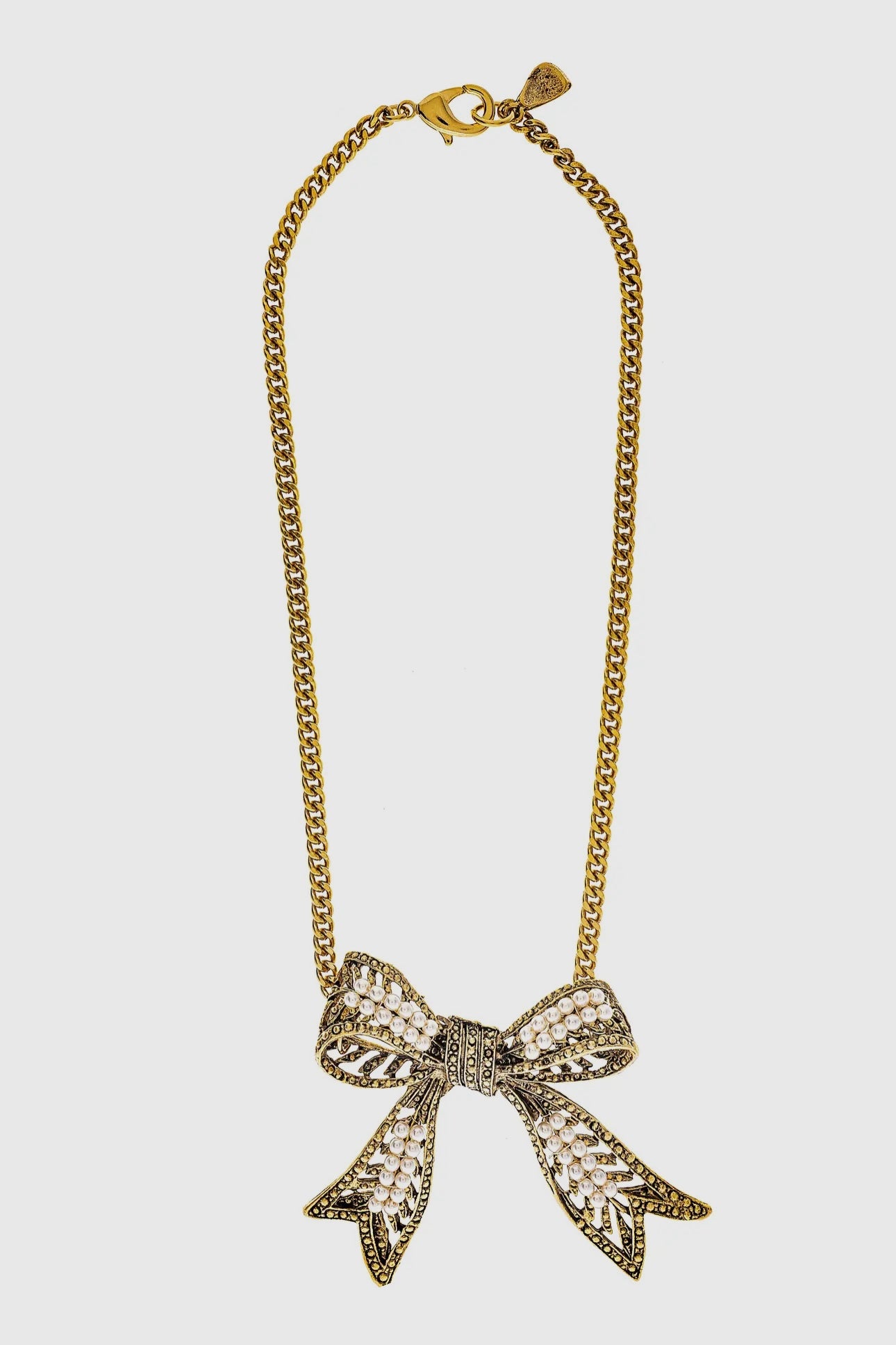 Yochi signature bow necklace with glass pearls. 22k gold plated over brass. Hand made in New York.